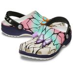El zueco clásico Shinobu de la colección Demon Slayer encarna la fuerza y la serenidad del Insect Hashira con este estilo etéreo. Estos zuecos de edición limitada presentan un degradado de color rosa, verde azulado y crema con detalles de líneas como las venas de las alas de una mariposa, que recuerdan a la capa kochou de Shinobu. El zueco clásico Shinobu está adornado con animados adornos Jibbitz™, incluyendo su característica tsuba de trébol de cuatro hojas y adornos de mariposa
